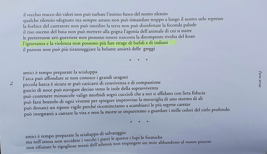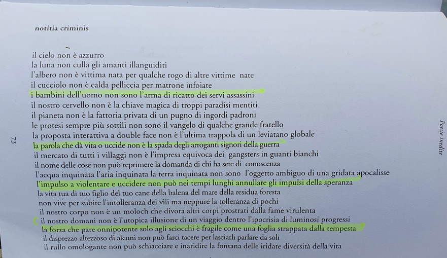 Lire le poème dans sa version originale (italien) datée octobre/novembre 1996, édité par la maison Vicolo del Pavone, Piacenza, via Giordano Bruno 6 – Italia